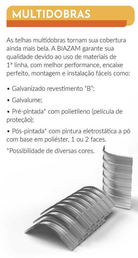 Na Biazam, as multidobras são fabricadas em aço Galvalume, Pré-Pintado ou Pós-Pintado, com geometrias e medidas definidas conforme a necessidade do projeto. São soluções sob medida, desenvolvidas para atender sua obra.